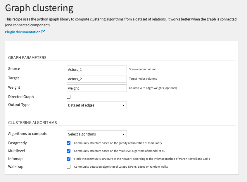 We will use the Graph clustering recipe to assign actors to different clusters based on some selected graph clustering algorithms.