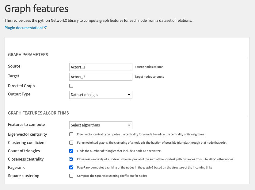 Then, the Graph features recipe will compute for each actor some common graph features such as pagerank, degree, eigenvector centrality, etc … .