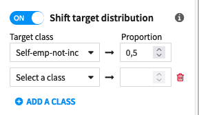 Target class > Proportion: For each of the model’s classes, you can map a desired proportion of rows belonging to that class to appear in the dataset. The dataset size remains the same, meaning depending on the initial distribution, some rows will be discarded whereas others will be oversampled.