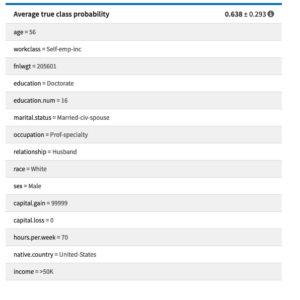 The critical sample card header shows either the average true class probability ± standard deviation (for classification), or the average predicted value ± standard deviation (for regression). The average and standard deviation are computed from the values on the control dataset and its altered versions generated by the stress tests.