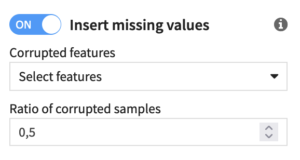 Ratio of corrupted samples: Set the ratio of samples from the control dataset where the values will be removed. The values will be removed for all the selected features simultaneously.