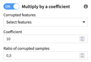 Corrupted features: Set one or several numerical features that will be multiplied by a fixed coefficient.