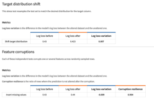 For each test, the resilience of your model is measured via several metrics that compare the model’s performance before and after the data changes and corruptions. The metrics are grouped by test types (Target distribution shift, Feature distribution shift, Feature corruptions).