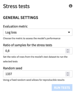 – Parameters to sample the model’s test set (the ratio of rows from the model’s test set to use for all the stress tests, the random seed)