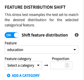 This stress test resamples the test set to match the desired distribution for a selected categorical feature.